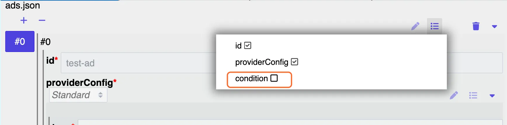 in default/storefront/assets , c reate a folder for the images of your ads (e g 'ads') 2\ upload some images to the folder to do that, p ress the 'actions' button 3 click on 'upload files' to upload the image you want to use 4 open the earlier created ads json and add an ad click on the '+' button 5\ add an id to your ad (e g test ad) 6\ add the image path and a target url the user will be directed to when clicking on the ad the target can be an external link or an internal link 7\ to add an internal link you may copy the following line and insert it into the target field make sure to change the ending into the name of your view (e g instead of name of view to home ) internal link purple //storefront/assets/resource/dynamic/storefront/index html?title bar=false\&force status bar=true#/name of view if you have ads for different devices, continue with the following steps if not, skip the following steps and continue with step 18 14\ click on the multi select button in the ads json 15\ press on the 'condition' option this will make a field named 'condition' available 16\ in the condition field, enable the fields 'comparevalue' and 'value' 17\ enter ' $context platform ' inside the value field and your desired device in the comparevalue field example if it is an ad for web, the comparevalue is web in the views json, chose a view (e g home) where you want to integrate the ad, press on the '+' button in the content 20\ change the content type to 'ad' 21\ insert your ad id from step 12 into the adid field depending on what content block number your ad is, it will appear in that order on your app e g in this example the content block is #0 so it will be placed at the top right below the app bar 22\ click on the burger menu 23\ click on 'update dynamic resources' 24\ name your changes, e g 'ads' 25\ click on 'merge all files to preview' you have successfully added a simple static ad in the experience html of your app, merged the changes and updated the dynamic resources you can test the result in the preview and push them live if they look fine, to make them visible in your live app